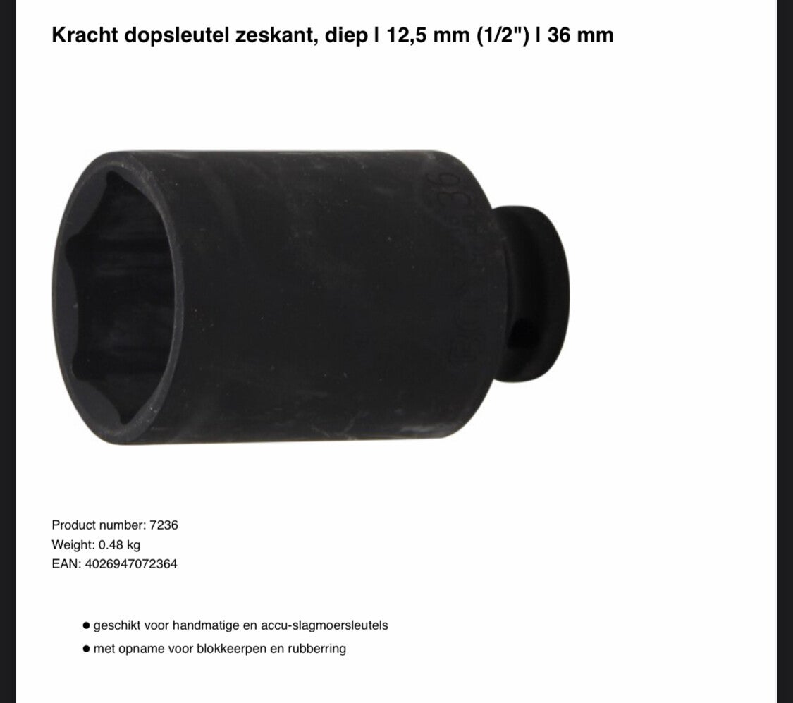 Kracht dopsleutel zeskant, diep | 12,5 mm (1/2") | 36 mm