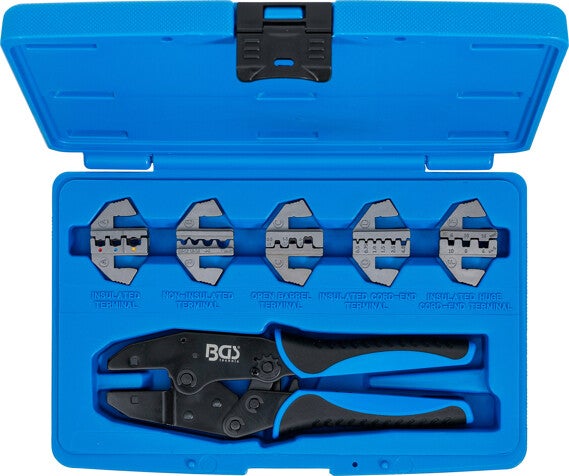 - Knijptangenset met automatisch ratelmechanisme en verstelbare blokkering en drukpuntontgrendeling