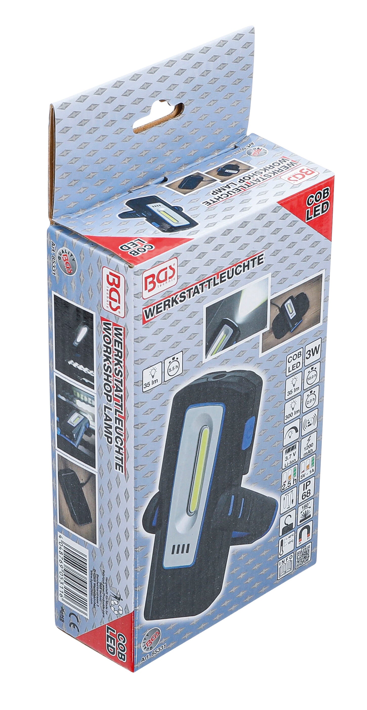 - Uitklapbare, 360° draaibare haak aan de achterzijde van de behuizing, om de lamp op vele verschillende plaatsen te bevestigen