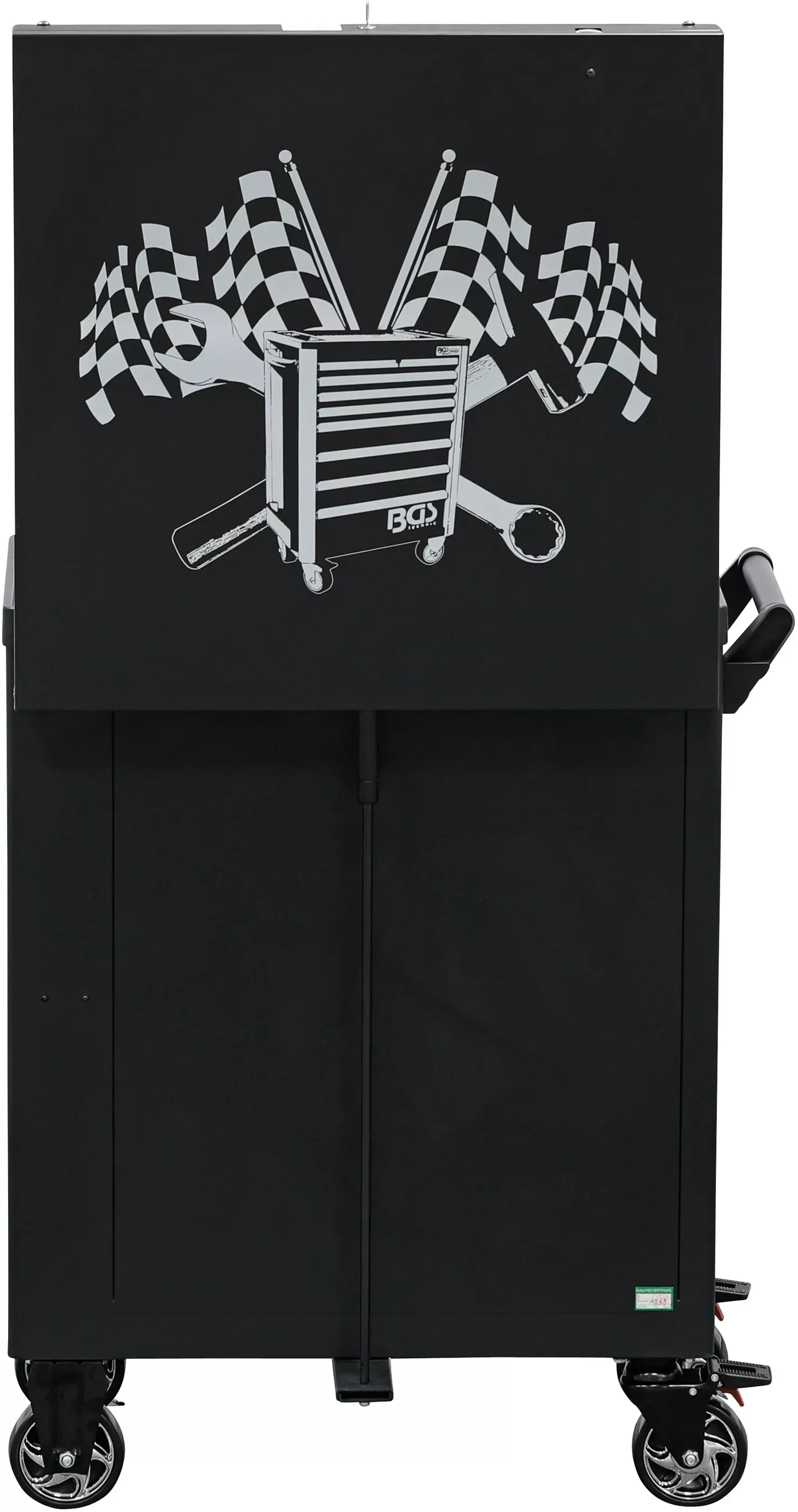 - in de kast aan de zijkant bevinden zich 2 aflegplateaus voor spuitbussen, gereedschap en flessen, alsook een geperforeerd paneel in het zwenkbare deurelement voor de montage van haken voor gereedschap