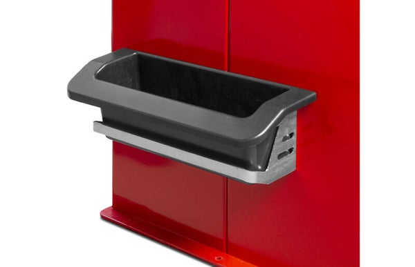 - Een grote kunststof afschermkap beschermt de gebruiker tijdens het draaien van het wiel