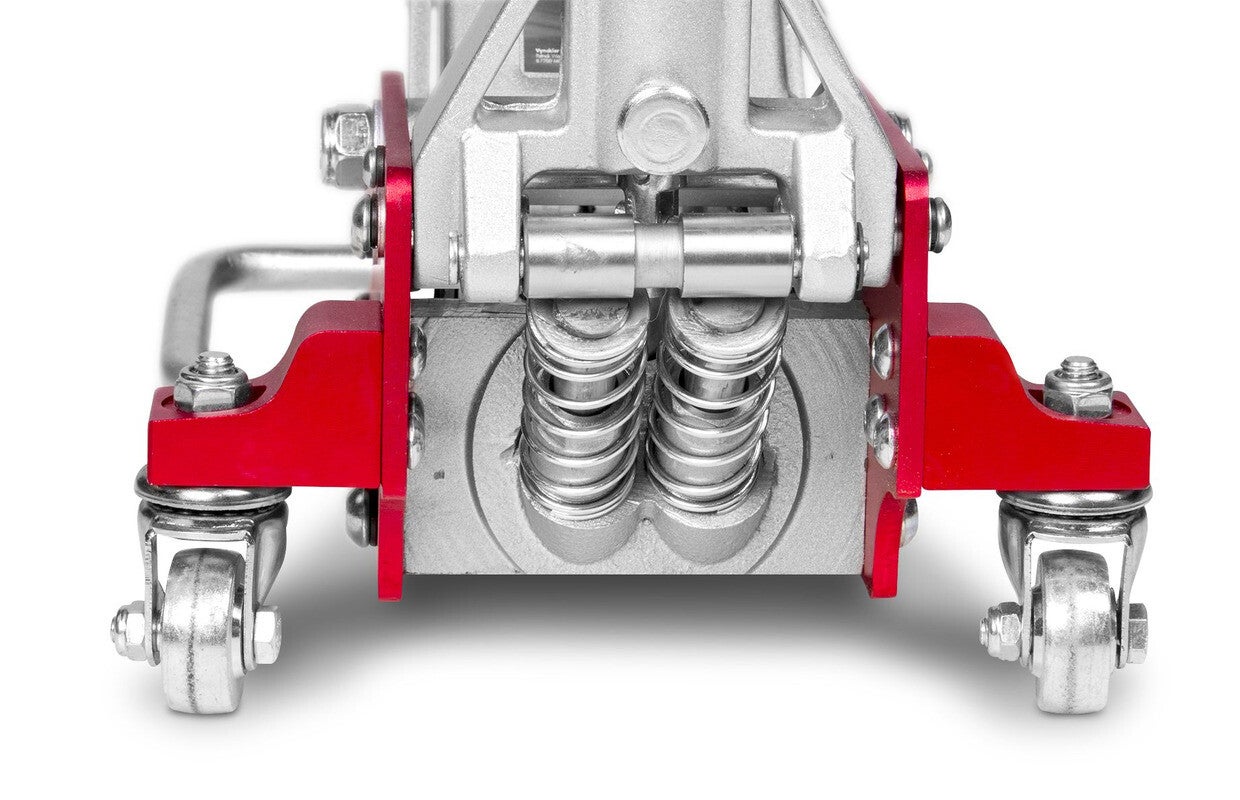 - Hoogwaardige Dubbele pomp: met 1 pompslag wordt veel meer olie verzet, zodat de krik heel snel wordt omhoog gebracht.