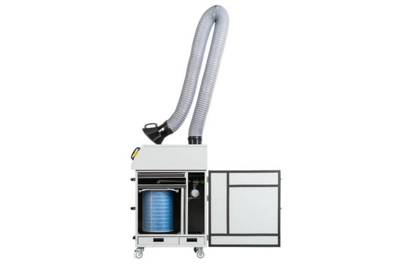 Luchtfilterunit voor lasrook en oliemist, met regelbaar debiet, filterreiniging, 3 meter arm en compacte vloeroppervlakte