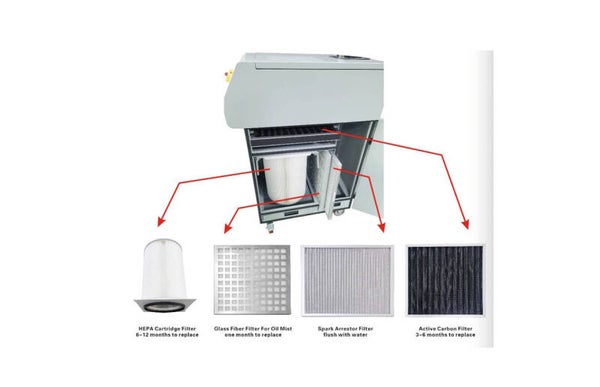 - Dankzij de meegeleverde glasvezelfilter kan naast rook van verschillende las- en snijprocessen eveneens oliemist en -nevel worden afgezogen en uitgefilterd.