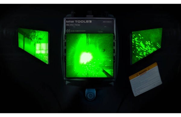 Groot centraal venster 100 x 93 mm, met optimaal zicht op de werksituatie en 2 vaste zijvensters voor een optimaal zijdelings zicht, ergonomie en werkcomfort.