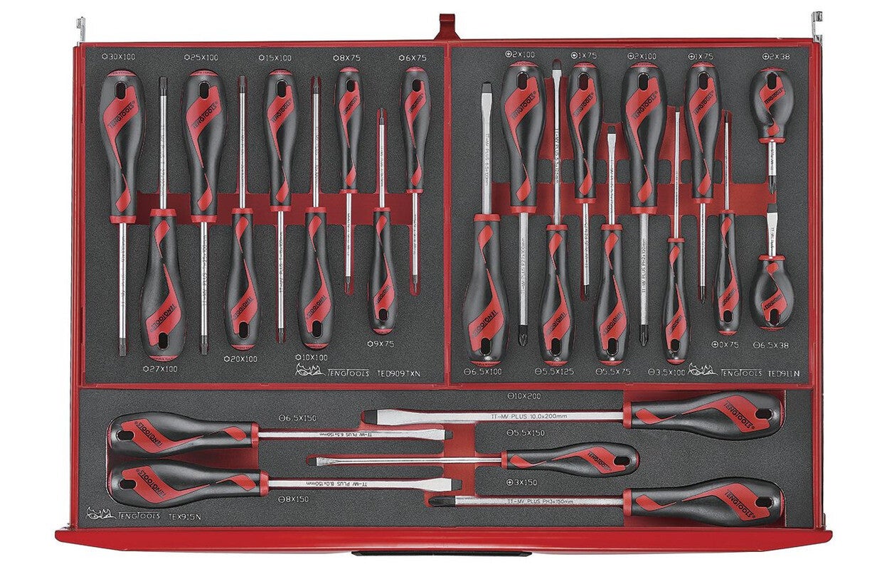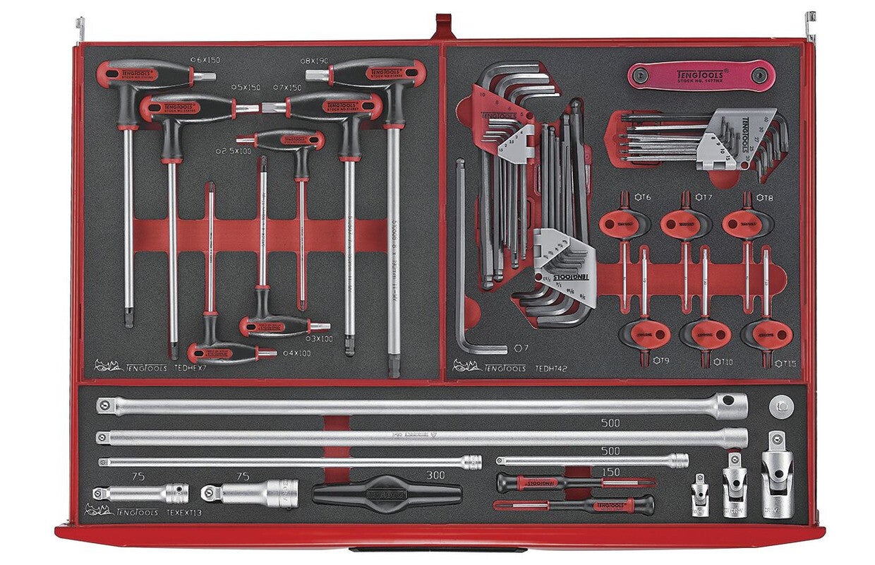 417-delige foamtray set. Deze Teng Tools toolset bestaat uit een samenstelling van 417 tools in het unieke Teng Tray systeem, opgeslagen in een gereedschapswagen. De schuimtrays zorgen ervoor dat de gereedschappen stevig op hun plaats zitten. Door de zwarte kleur met rode onderkleur valt het extra op wanneer gereedschappen ontbreken.