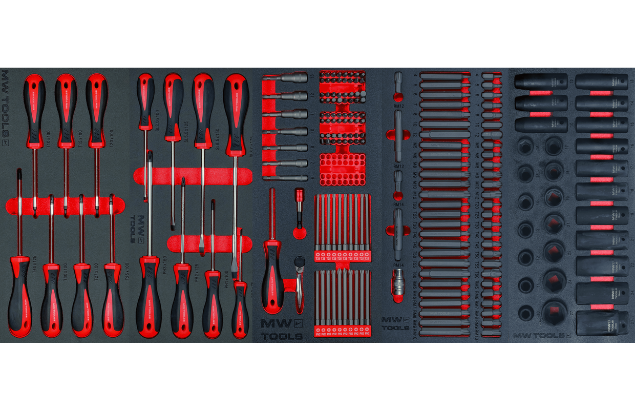 Elk MW TOOLS gereedschap ligt op zijn juiste plaats en zorgt voor meer efficiëntie, comfort en veiligheid. Zo krijgt u een veilige toegang tot het gewenste gereedschap zonder tijd te verspillen want het gewenste gereedschap ligt op de juiste plaats opgeborgen. Met deze geoptimaliseerde opstelling in de complete MW TOOLS gereedschapswagen zijn er geen onderbrekingen en stilstandtijden meer bij het zoeken naar uw gereedschap in de lade.