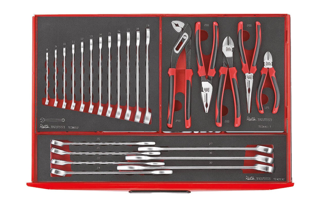 Deze set combineert een gereedschapswagen met 7 lades met het "foam trays" opbergsysteem. De foam trays houden het gereedschap goed op zijn plaats. De contrasterende rode en zwarte kleuren maken het mogelijk om ontbrekend gereedschap onmiddellijk te identificeren.