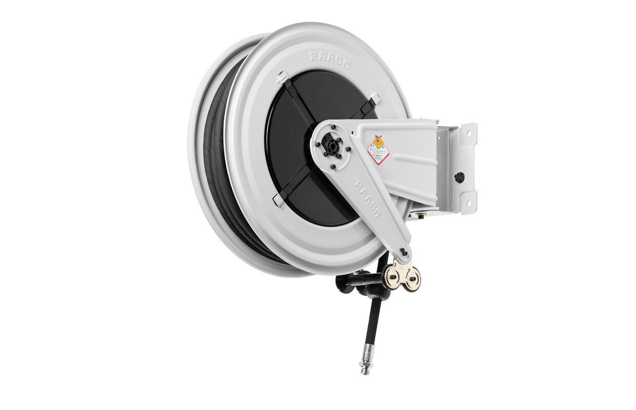 Haspel perslucht en water 25 m Ø G 1/2" (f) 20 bar Gepoederlakt staal met automatische oprol en zwenkbare muurbeugel Raasm