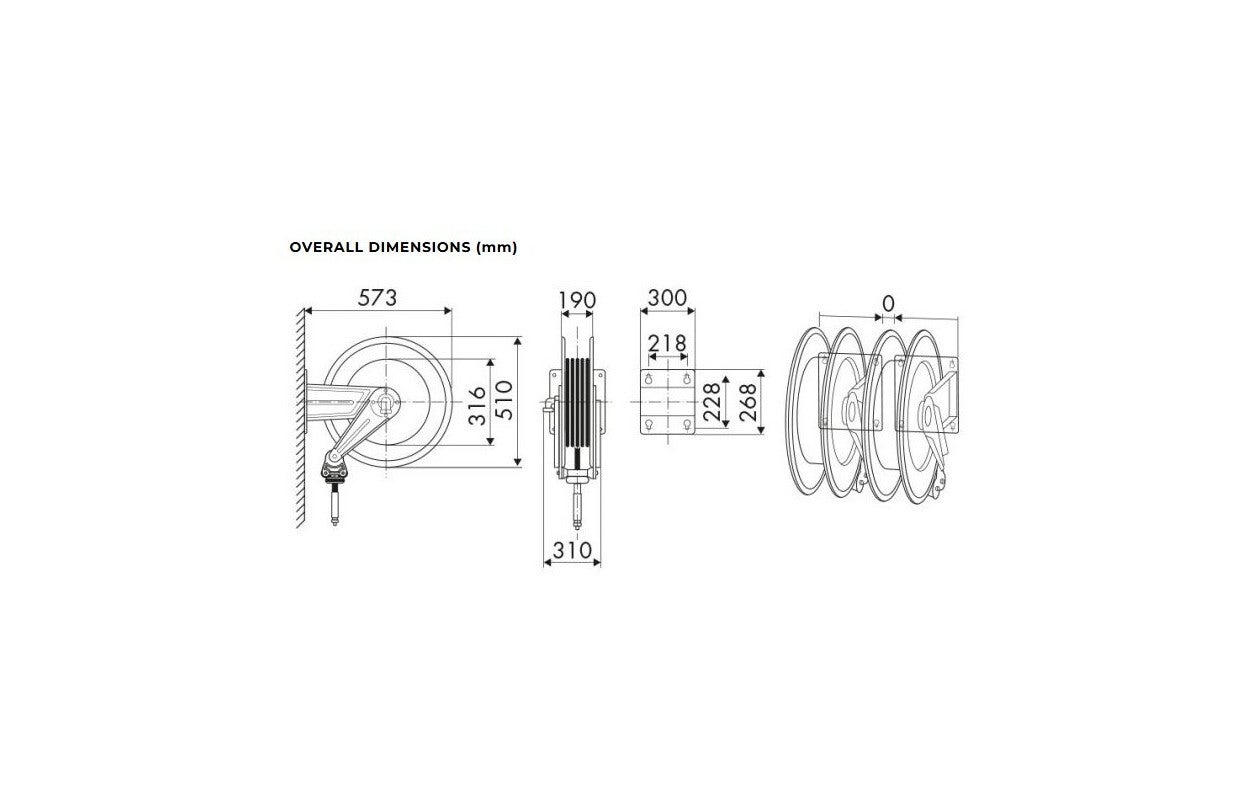 Haspel perslucht en water 30 m Ø G 1/2" (f) 20 bar Gepoederlakt staal met automatische oprol en vaste muurbeugel Raasm