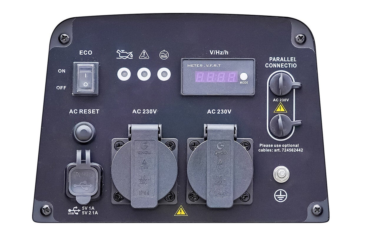 - 1 Parallel contact op het frontpaneel, voor het koppelen van 2 generatoren aan de optionele parallel stekkerdoos (art. PB3210). De generatoren leveren dan samen stroom via de stekkerdoos waardoor u meer vermogen kan afnemen dan van de afzonderlijke (kleine) generatoren. Dit is nuttig bij grote verbruikers zoals warmtepompen, zwaardere machines met elektromotoren, servers, heaters, enz.