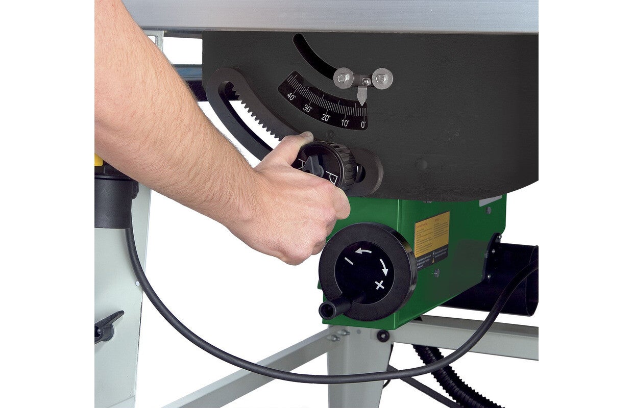 - Hoogteverstelling van het zaagblad dankzij handwiel aan de bedienerszijde