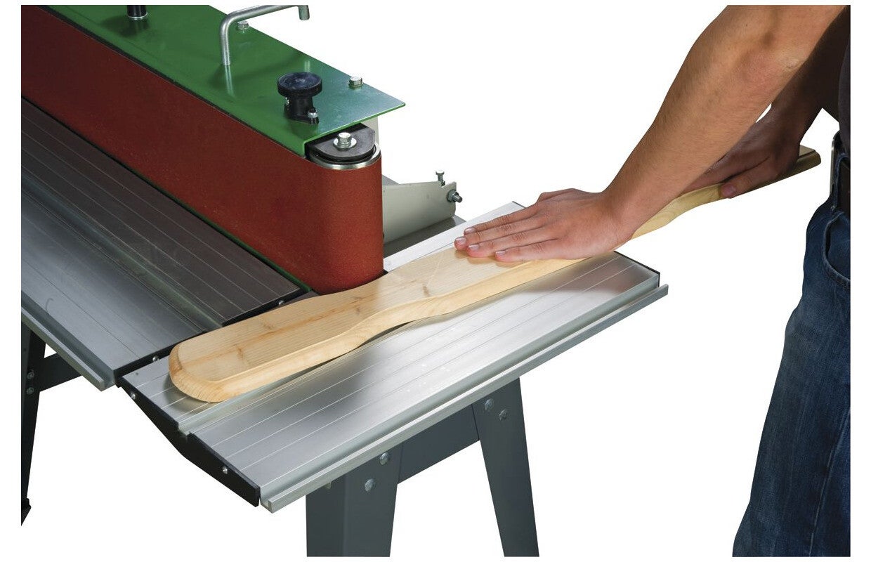 Bandschuurmachine met verstelbare schuurunit en 2 stabiele tafels, met een krachtige monofasige 230V motor.