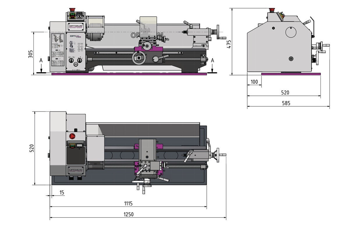 Metaaldraaibank centerhoogte 125 mm centerlengte 550 mm spilboring 26 mm 1,1 kW 230V variabele snelheden Optiturn