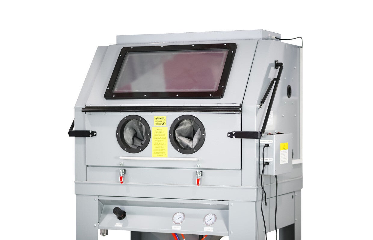 Cabine met binnenmaten 1180x850x850mm geeft voldoende ruimte en bewegingsvrijheid voor het stralen en manipuleren van kleine en middelgrote werkstukken