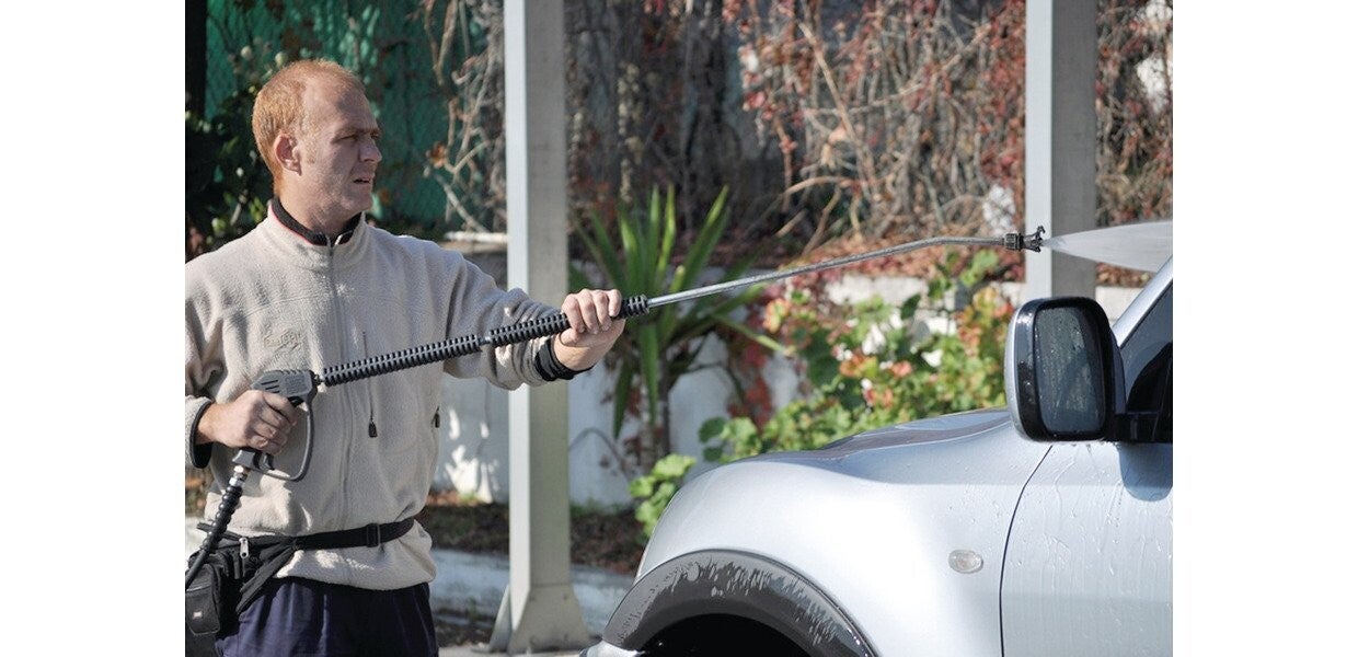 Praktisch ontwerp: Handige houders zorgen voor een opgeruimde opslag van het handspuitpistool, de straalbuis, de hogedrukslang en de stroomkabel. De slijtvaste hogedruk waterslang garandeert extra duurzaamheid