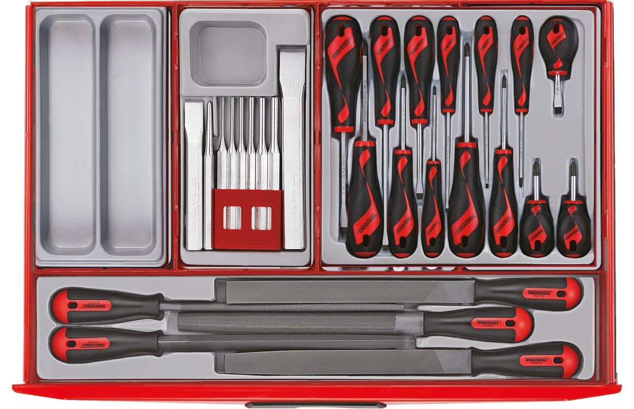 Deze Mini Master Tools set bestaat uit een set gereedschappen georganiseerd in het unieke Teng Tools systeem, allemaal opgeborgen in een gereedschapswagen met 10 laden.