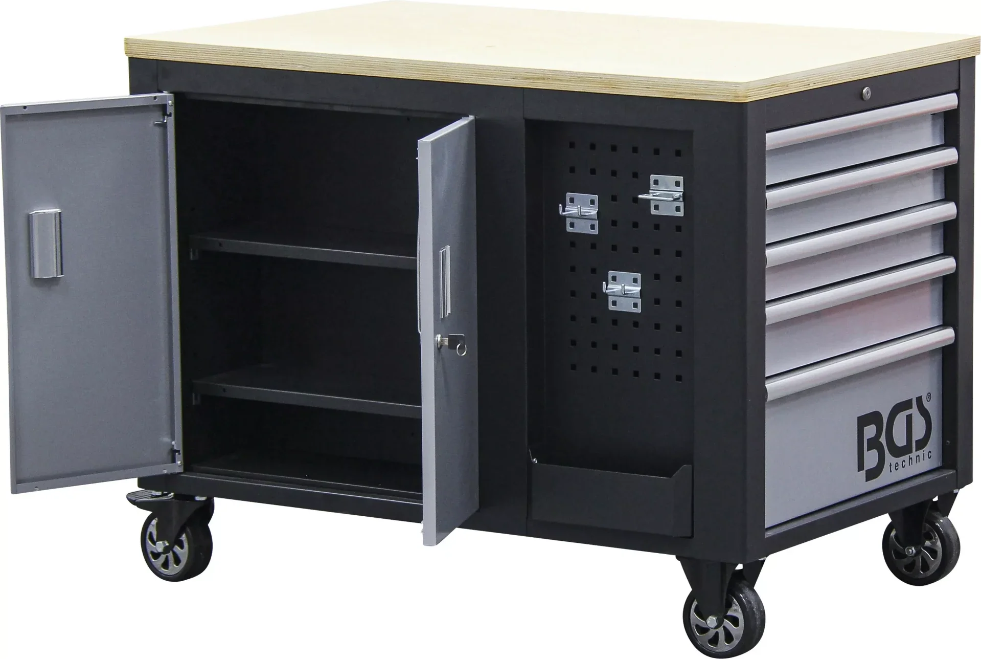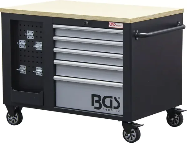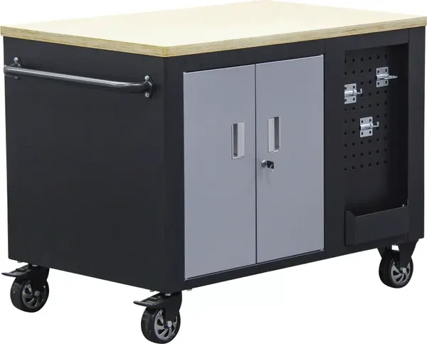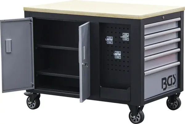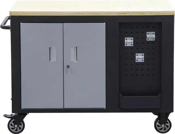- 2 aflegplateaus met bovenliggende geperforeerde wandplaat om gereedschap en andere gebruiksvoorwerpen op te hangen, incl. hakenset